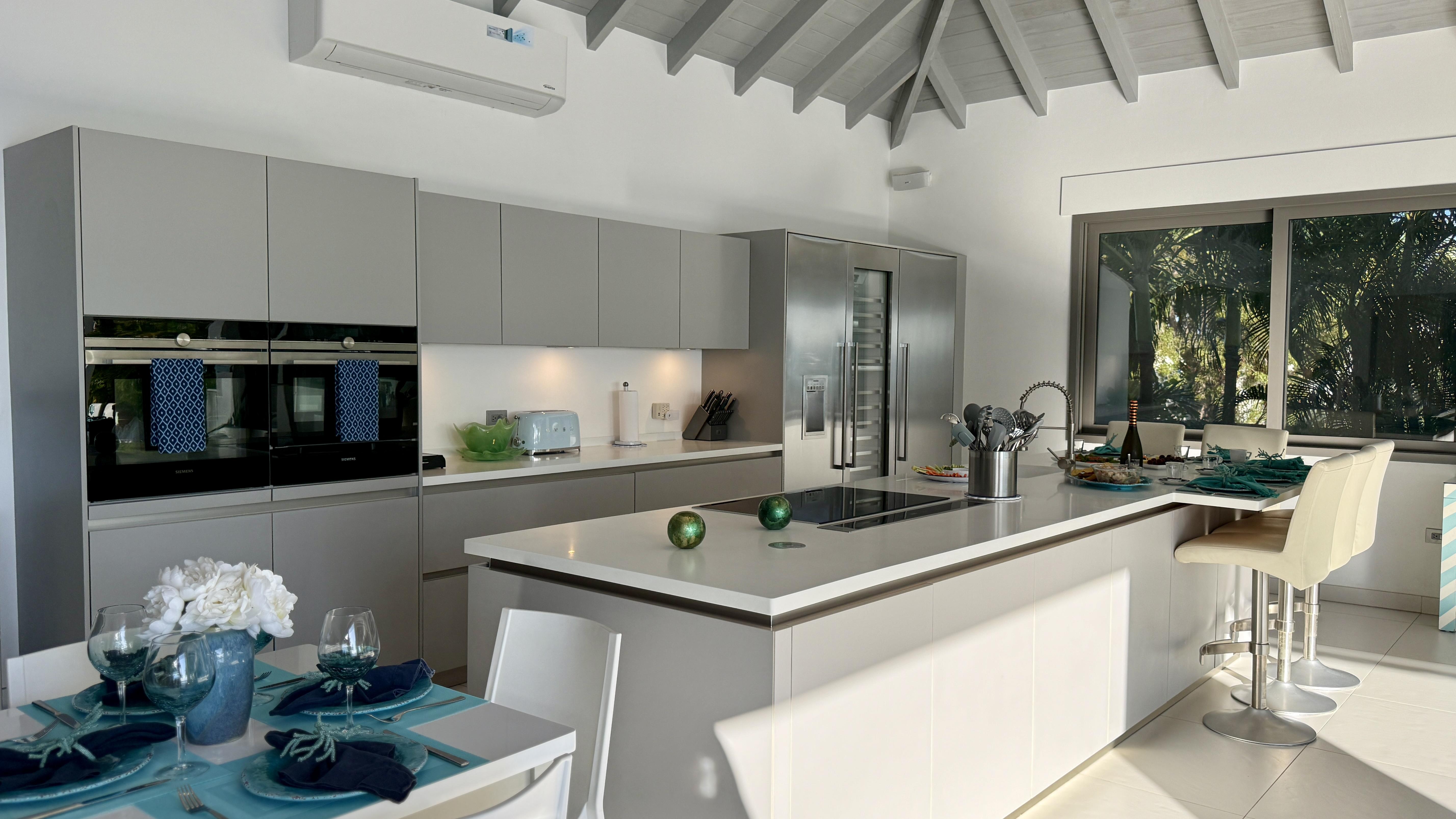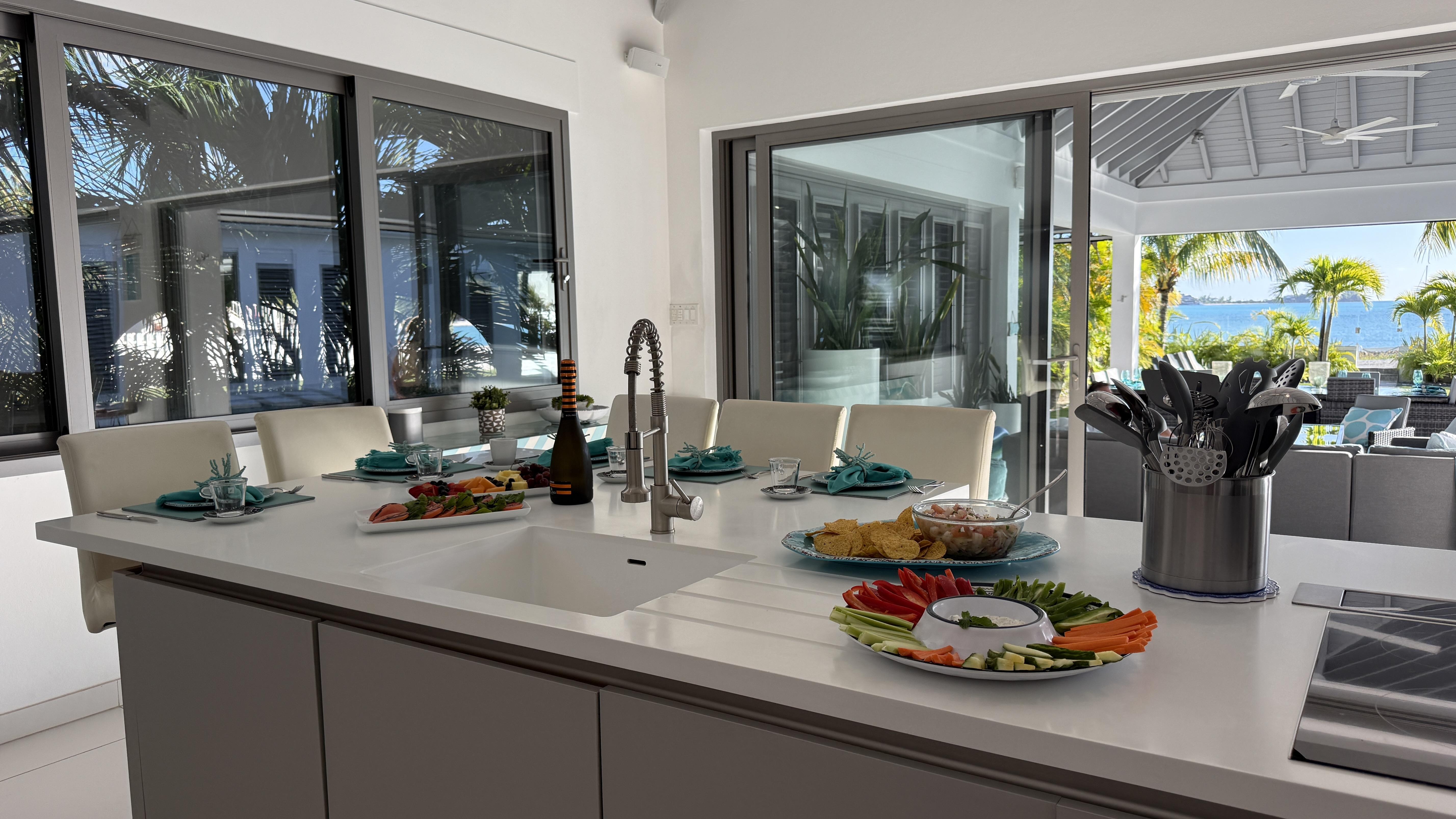 At the center of the home, a chef’s kitchen flows effortlessly into the main living spaces and out to a fully equipped outdoor kitchen with dedicated dining, seating, and lounging zones—ideal for entertaining or quiet evenings by the pool.