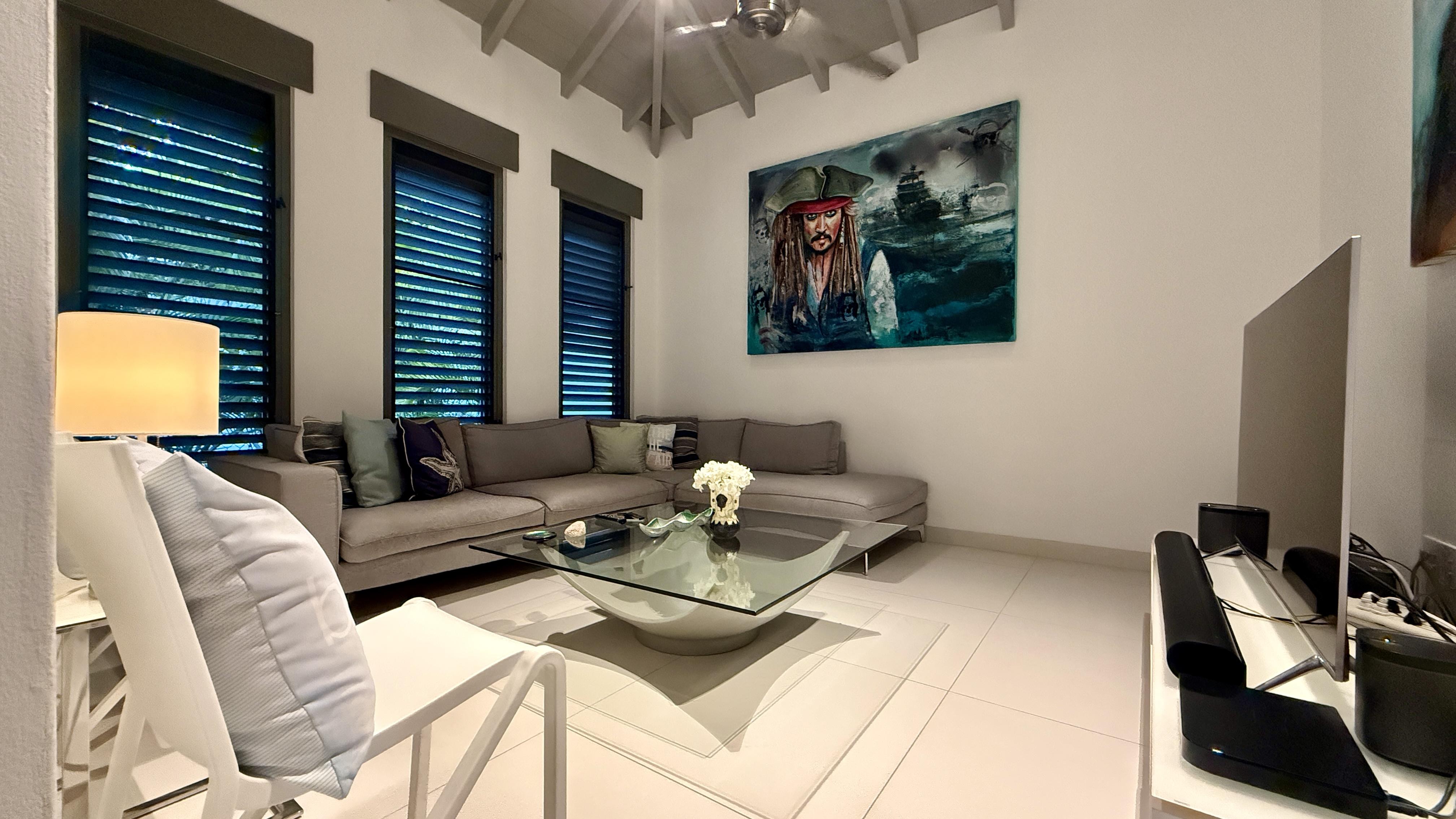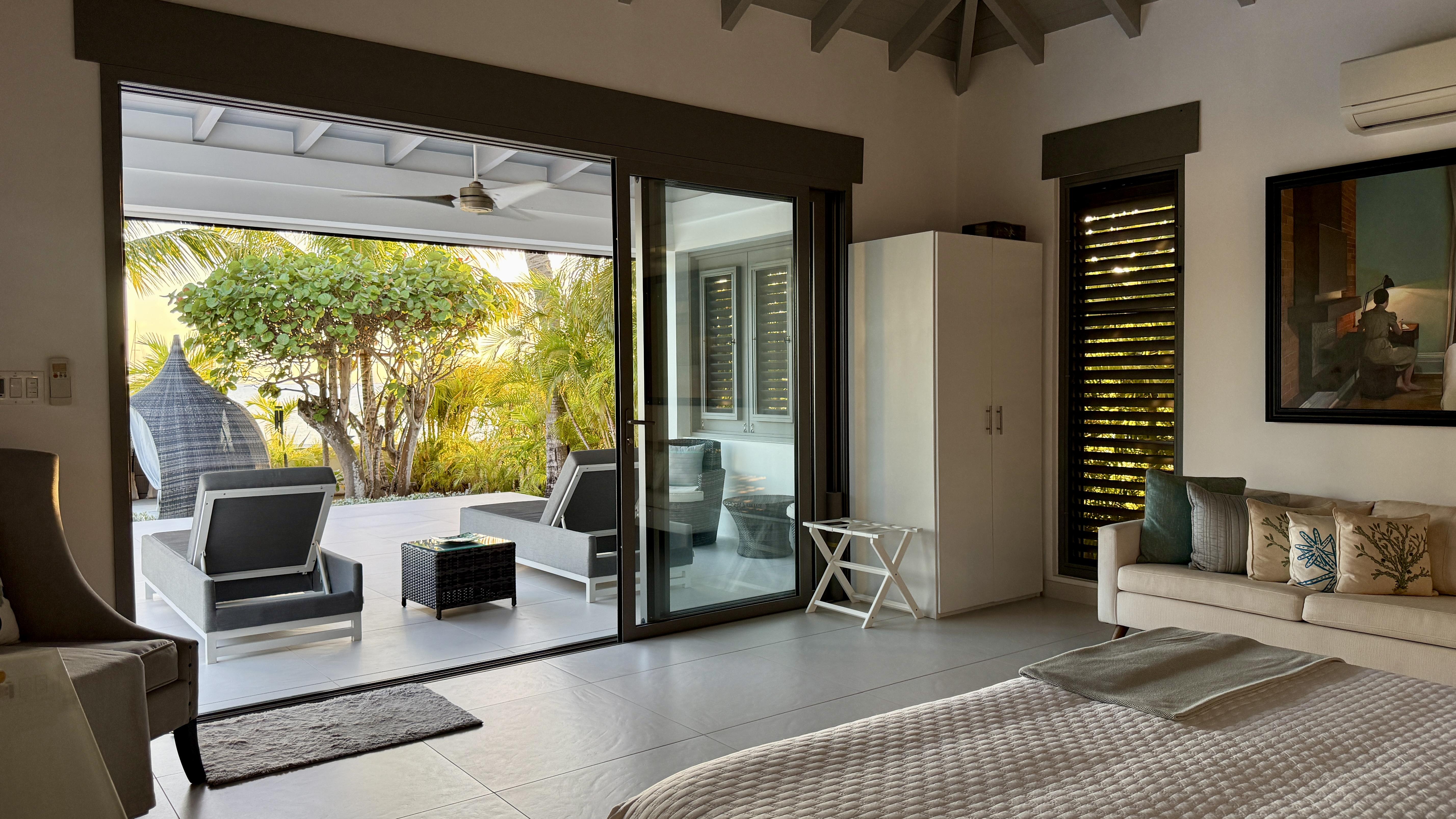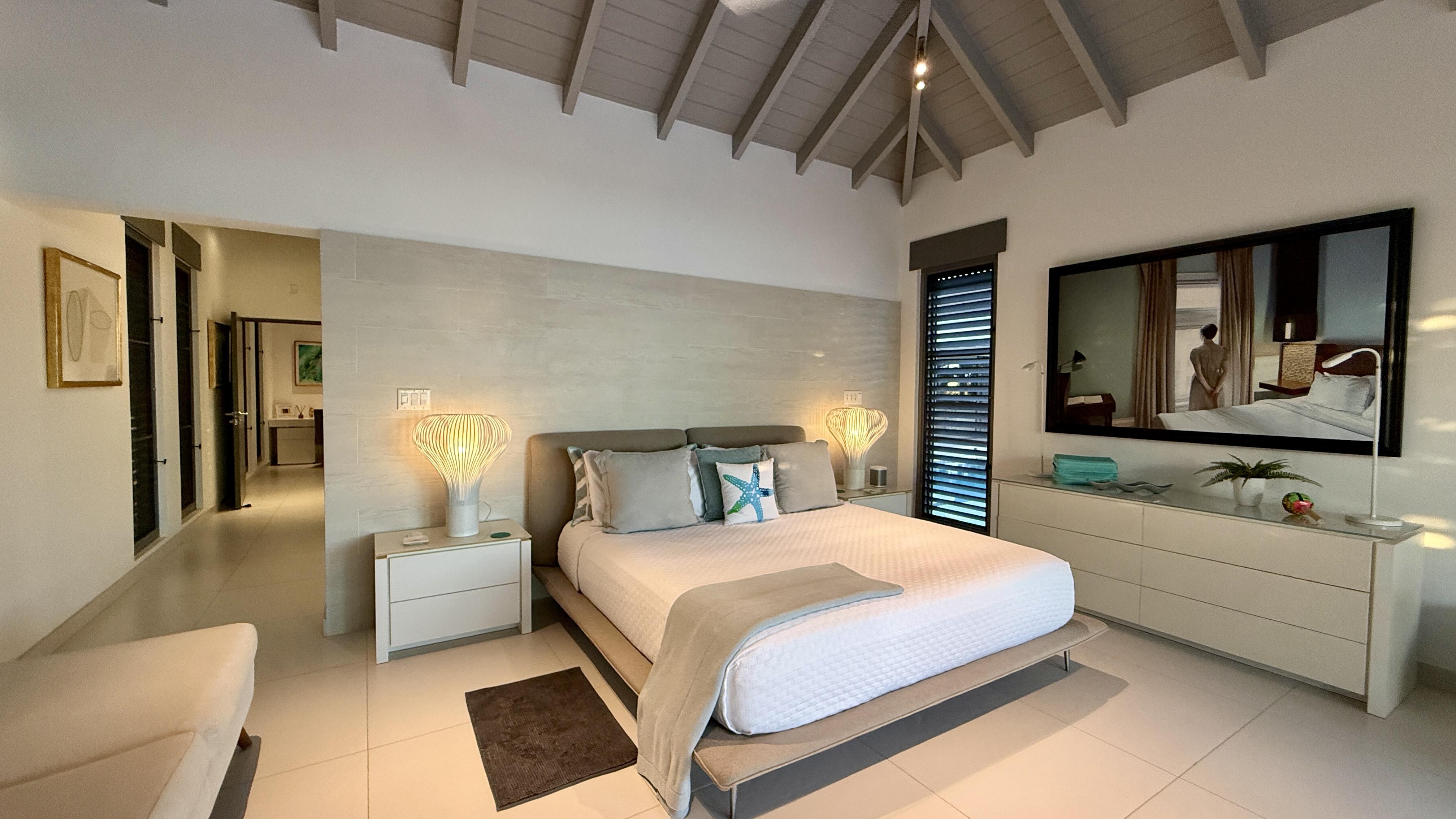 Effortless beachfront living meets thoughtful design at The Beach House, a beautifully appointed home set directly on the sand in the coveted South Finger of Jolly Harbour. The home offers 3 bedrooms and 3.5 bathrooms, anchored by a beautifully considered master suite featuring a walk-in wardrobe and a spacious spa-style bathroom with a rain shower and freestanding bathtub.